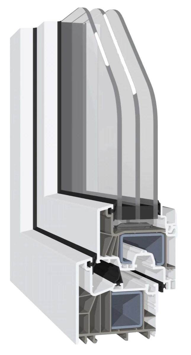 As nossas janelas em PVC apresentam um sistema de isolamento de câmaras de ar e junta para obter valores de isolamento óptimos em janelas com profundidade até 72mm e uma secção transversal visível reduzida a 113mm, o que permite maior entrada de luz natural.
